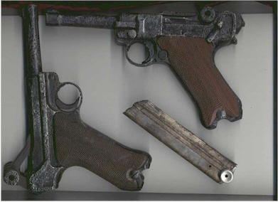 of corrosion. On the other side of the track I started back to where I had left my car about 500 meters distant as the light was already fading when a massive iron signal rang through the headphones, parting the mossy turf revealed the rotting remains of pine tree stump collapsing in on itself and brushing this aside another sweep had the signal coming from the base of this dead tree. I carefully cleared the wood back and there on the surface I saw the outline of the classic German officer's sidearm a P 09 Luger 9mm parabellum. The pistol was a mass of rust, the thin wooden hand grips long since disintegrated giving a view into butt where the magazine slid home, but it was otherwise complete and empty. Careful restoration proved the it to be an S/42 P09 Luger made under license from the Mauser company for the Wehrmacht in 1936. My next visit to this woodland was about a week later I left work early I had it in mind to search through from the rear of the wood so parking the car I struck out into another section of the wood. This area was also in stark contrast to the surrounding farmland as once inside the ground rose in a long ridge at right angles to the valley like a wrinkle in some huge rug and on either side of the ridge the ground rose and fell unevenly. This part of the wood was old and not so well cared for as in the other sections I had walked through, the trees were a mixture of old fir and beech with many trees in various stages of decay and leaning at crazy angles some supported only by their neighbors, so some care was needed. (I was in woodland once before and was taking a ciggie break with a friend when with a terrific splintering crack a tree in an area we had just been searching came crashing down ,cue a few choice words, it wasn't funny.) I had only about an hour to spare so I made a quick circular search, I had been searching for about ten minutes and had only the usual grotty pfennigs in my pocket when I had a mass of positive signals clustered around the base of a dead fir tree. Removing the surface turf exposed a cardboard box 10cms x 10cms square packed with K98 Mauser carbine cartridges still intact after more than 50 years in the ground, next to these lay a number of 9mm parabellum rounds loose and a small quantity of ammunition of various calibers. These I removed and disposed of later. I rounded the back of the tree and immediately got an earsplitting iron signal and parting the forest turf revealed the outline of another Luger. On inspection this one was in a slightly better state, the ground was not as waterlogged and so the corrosion was superficial. Subsequent searches of the surrounding area produced a few items of military equipment including an empty magazine for the same pistol, an elevation gun sight and an empty bayonet scabbard. I must say I was absolutely chuffed to find two similar guns in one month as they are not common finds here in our locality and although I prefer to make finds from earlier periods they were nevertheless very welcome additions to my collection. During restoration it became obvious that this pistol differed in minor details to the first I'd uncovered and it proved to be a P08 Luger manufactured by the Mauser Company in 1915 and carried the Mauser Company monogram engraved on the top of the knee link breech. The most well known of German personal side arms, the Luger P08 enjoyed a position as somewhat of an erstwhile status symbol amongst service personnel, (this status being somewhat colored with nostalgia and ill deserved as contemporary reports show the P08 as having a reputation for regularly discharging in the holster, the complex nature of its action an susceptibility to powder and dirt ingress also meant it was difficult to maintain in the field, misfiring and jamming were common occurrences.) even after being superceded by the more modern Walther P38. The Walther being cheaper to produce and more reliable in the field. The Luger 08 and 09 were semi automatic firearms, (the action of firing a shot ejected the spent cartridge case, forced another round up into the firing chamber and cocking the weapon for the next shot) and both had eight shot capacity magazines that slid home into the elongated butt, part of the hallmark of this design. The more antiquated Luger the patent of which dates to end of the last century although a masterpiece of German engineering required very accurate machining tolerances necessary because of the unique breech arrangement. This absorbed many valuable man hours for its manufacture at a time when the German arms industry could ill afford them and so its replacement was inevitable. It needs to be stressed that safety is paramount when undertaking this type of searching no one should take any chances with any type of live ordnance however small, with disposal being carried out by the proper authorities. RESTORATION. The two pistols as found were both heavily rusted, the corrosion being more severe on the side in contact with the forest floor. The wooden handgrips on both firearms had long since decayed as they were found next to two dead trees, the ground being fairly damp. On first examination I let both pistols stabilize for 24 hours at room temperature and afterwards gave them a rinse in water to remove any loose material, and the surfaces were scrubbed with a tough wire brush, this helped to remove the last traces of the rotten hand grips still remaining. Next I laid both guns in a strong solution of Aetznatron in a plastic container, a treatment that requires a well ventilated room rubber gloves and eye protection as this chemical is very corrosive not only to iron oxide but also is very aggressive to organic material too. The solution is one part Aetznatron to two parts water, the chemical being added to the water and not vice versa as heat is produced in the process (do not inhale the fumes produced). The solution is used normally as a drain unblocker or to unfreeze water pipes and is avai